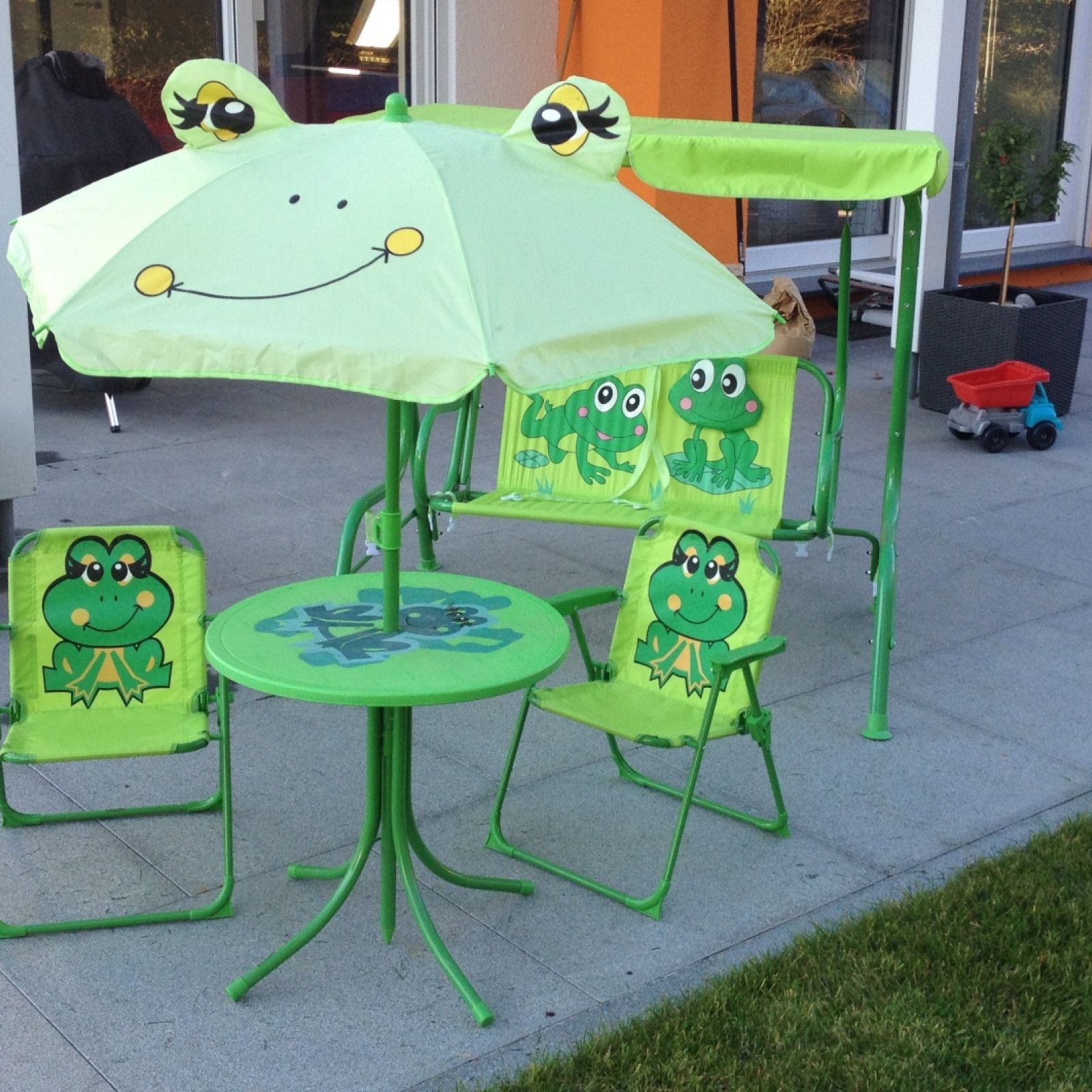 Im Garten gibt es eine mehrere Schaukeln inkl. Rundschaukel, ein Trampolin und einen Sandkasten sowie viel Rasenfläche zum Toben und diverse Spielgeräte. Ein großer Spielplatz ist auch in der Nähe, zu dem wir Ausflüge machen können. Im Sommer wird auch ein Planschbecken aufgestellt.